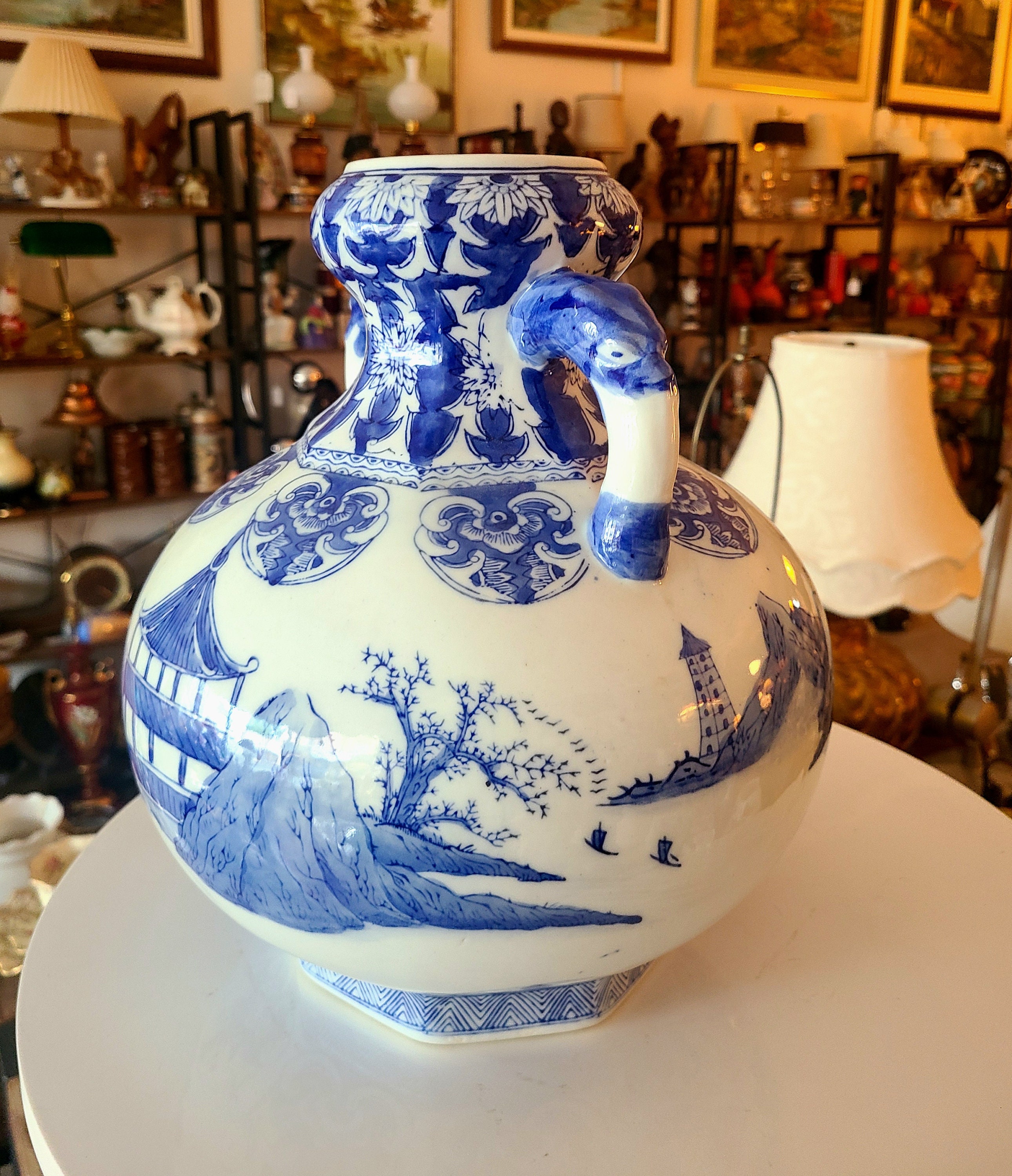 Large handcrafted blue and white Chinoiserie ceramic vase with handles in good vintage condition, depicting a 'Chinese pagoda' scenery.